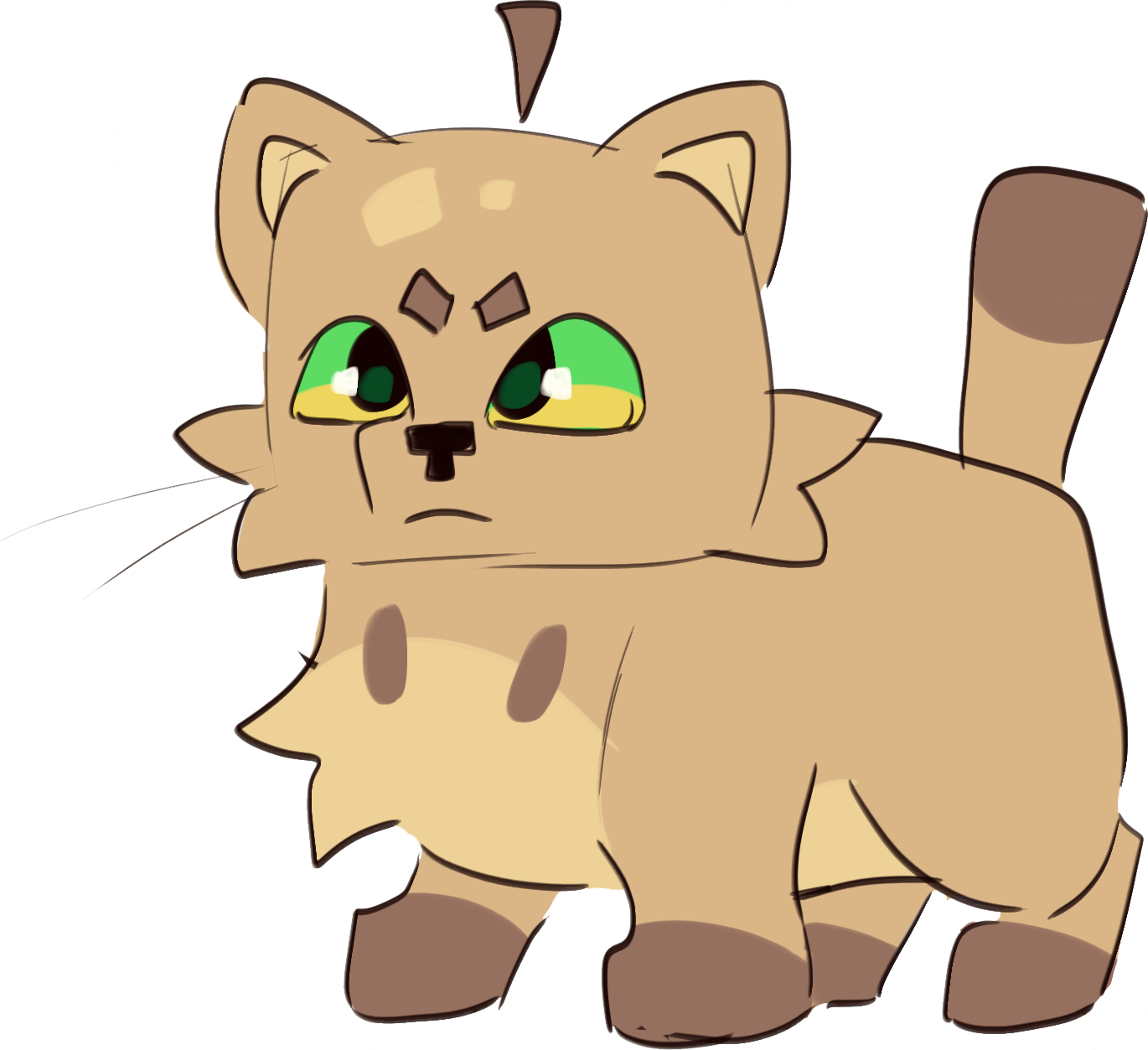 Appledusk is a large, well-muscled light brown tom with green eyes. He has very square features, with a short, thick pelt, small ears, and a blocky muzzle. He has a thick neck with broad shoulders, thick legs, small paws, and a short, somewhat thick tail. He has darker patches on his paws and tailtip, and a pale underbelly.