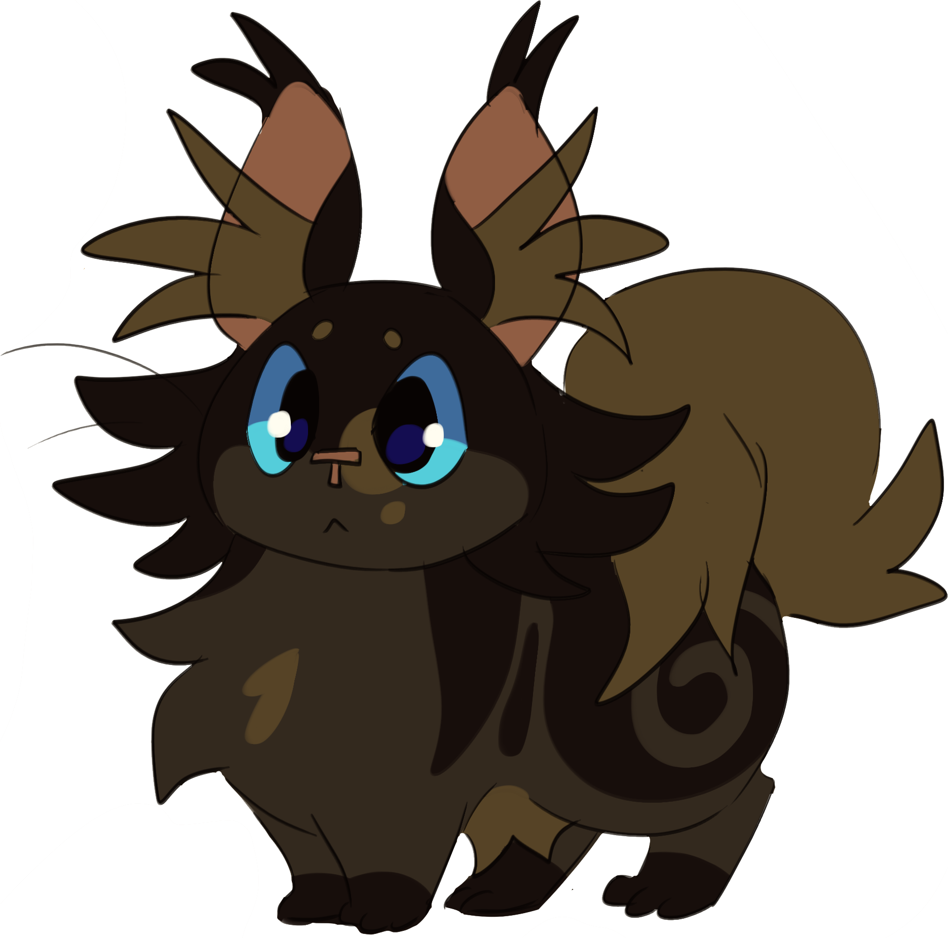 Birchface is a huge, dark brown tabby tom, with fur so dark it is almost black. He has tall, tufted ears, with long, shaggy fur all over his body. He has a round face with a wide muzzle, dark blue eyes, and thick, fluffy fur around his neck and a round belly. He is broad-shouldered, with short, skinny legs and small paws. His tail is thin and scruffy, curling back up over his body. He has marbled tabby patterns along his side, and paler blotches on his face, chest, underbelly, and tail.